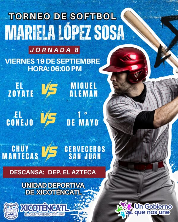 El Gobierno Municipal invita cordialmente a toda la comunidad al VIII Torneo de Softbol “Mariela López Sosa”, que se llevará a cabo el próximo viernes 19 de septiembre en la Unidad Deportiva, a partir de las 6:00 p.m.