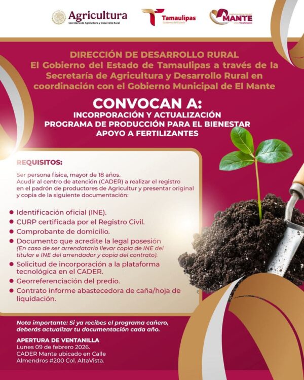 El Gobierno Municipal de El Mante 2024–2027, que preside Patty Chío, informa que el Gobierno del Estado de Tamaulipas, a través de la Secretaría de Agricultura y Desarrollo Rural, en coordinación con esta administración municipal, convoca a la Incorporación y Actualización del Programa de Producción para el Bienestar – Apoyo a Fertilizantes.