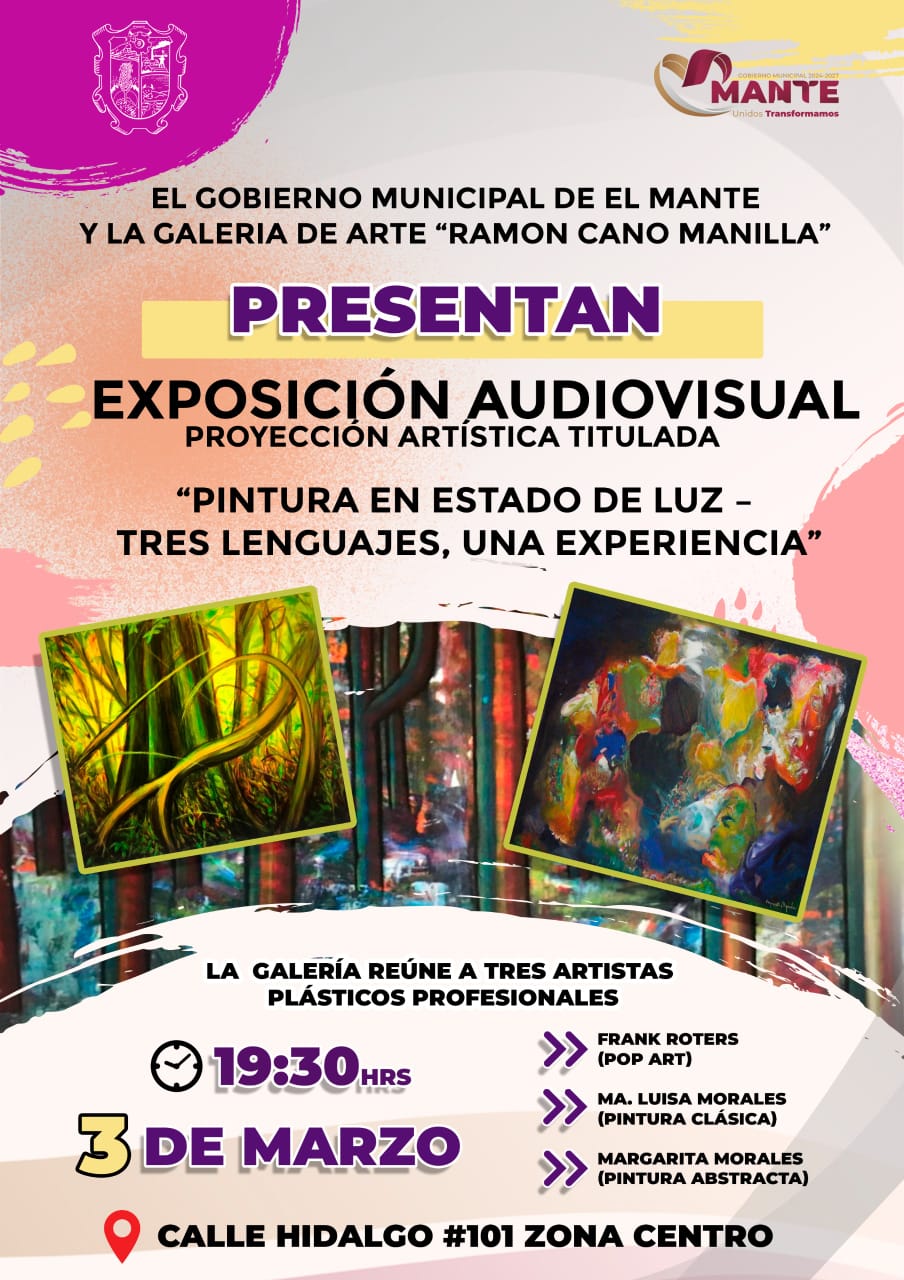 El Gobierno Municipal de El Mante 2024–2027, que encabeza la presidenta Patty Chío, en coordinación con la Galería de Arte “Ramón Cano Manilla”, invita a la ciudadanía a la Exposición Audiovisual y Proyección Artística titulada “Pintura en Estado de Luz – Tres Lenguajes, Una Experiencia”.