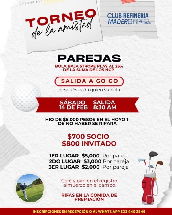 Tenemos en puerta el Torneo de la Amistad el sábado 14 de Febrero en el Club de Golf Refineria Madero, por parejas y formato Bola Baja, informes al: 8334402846.